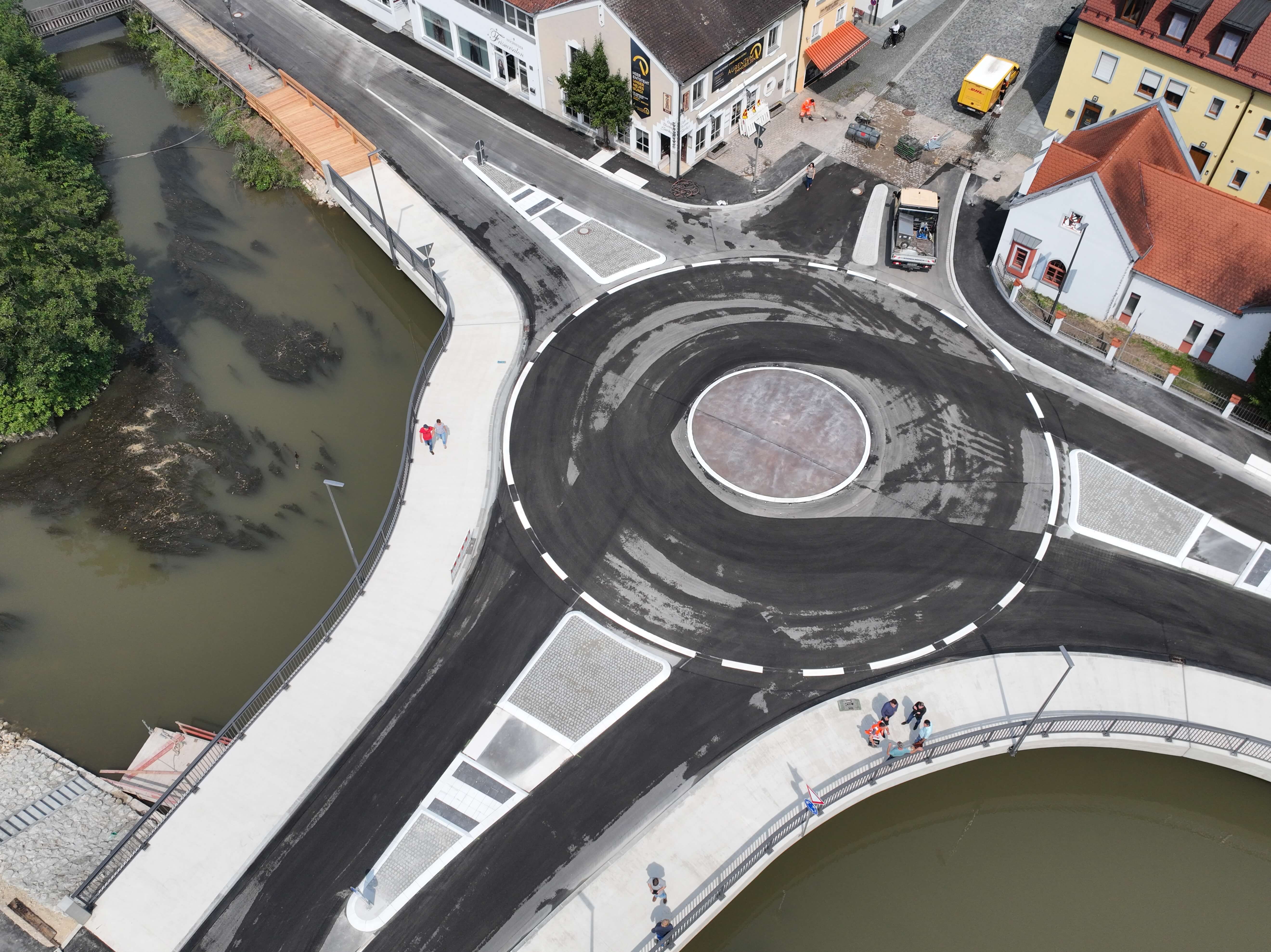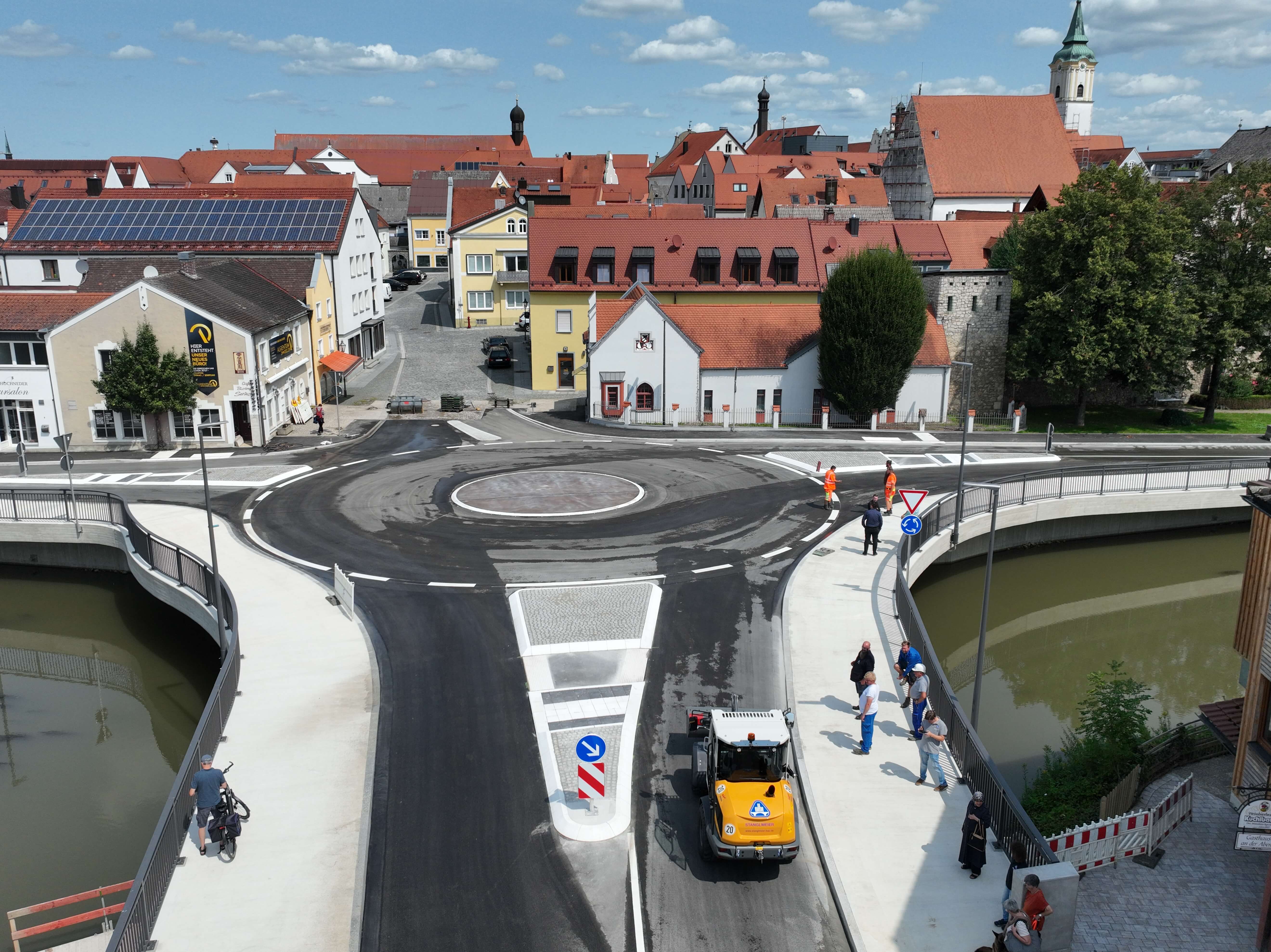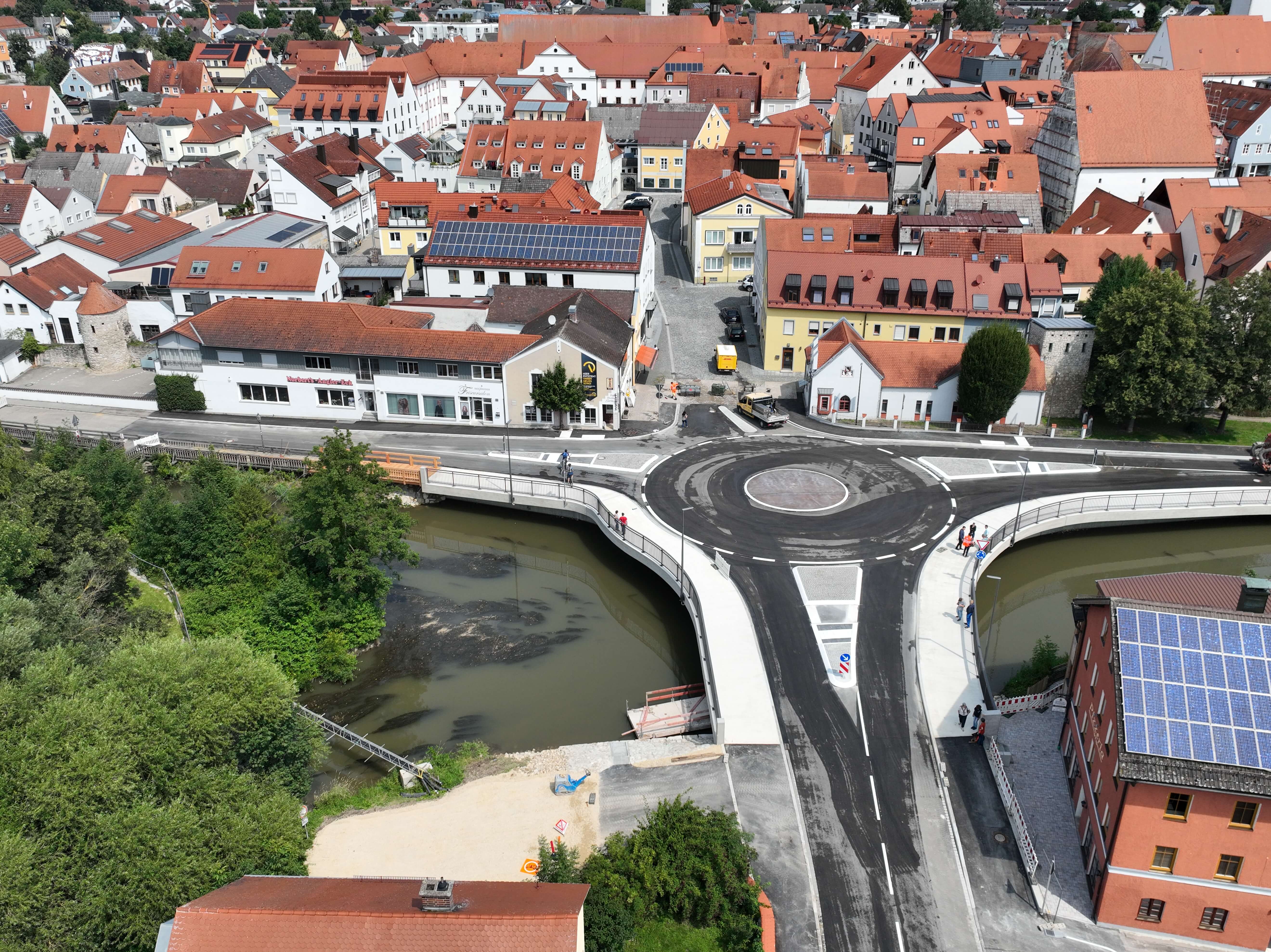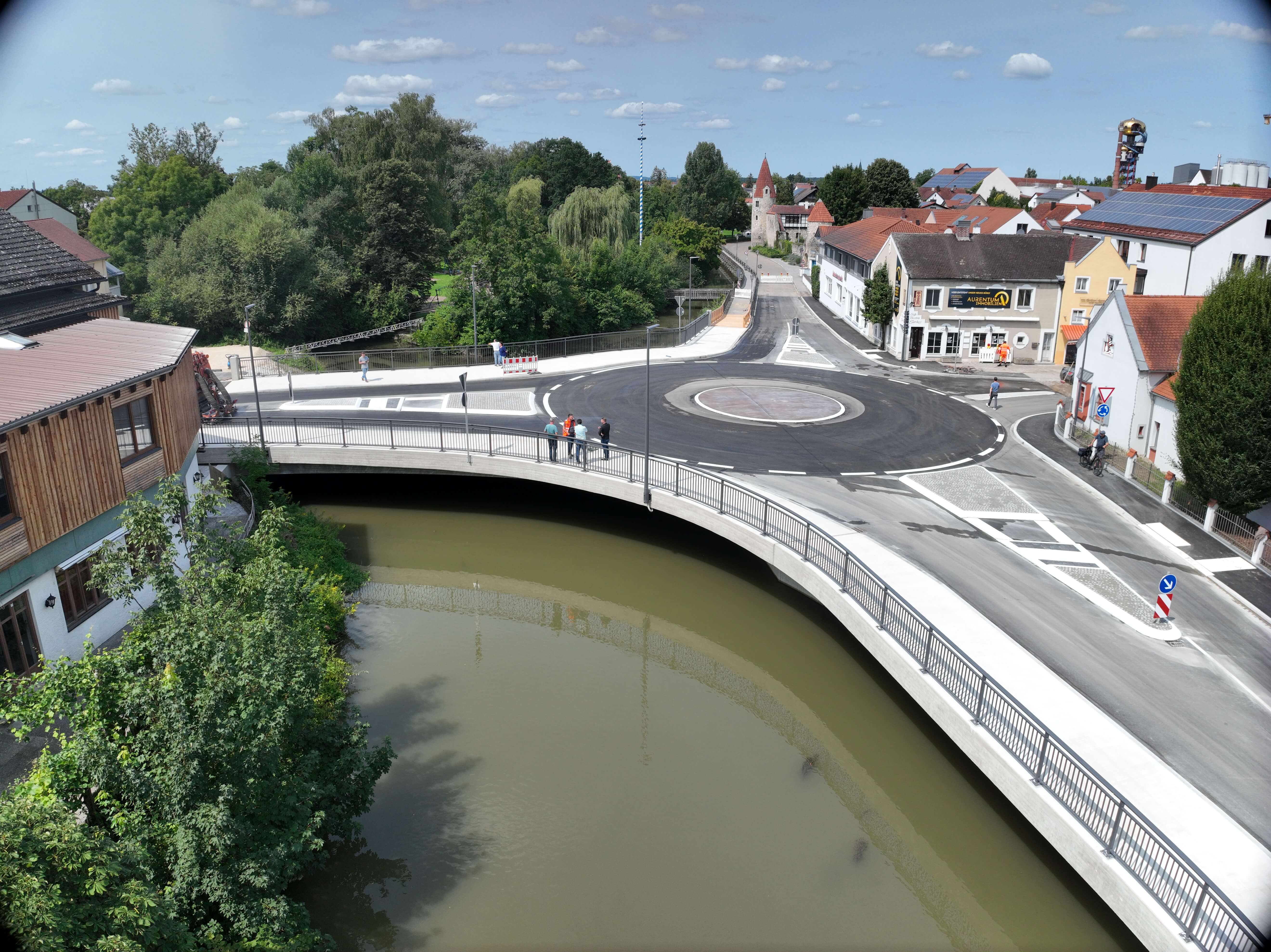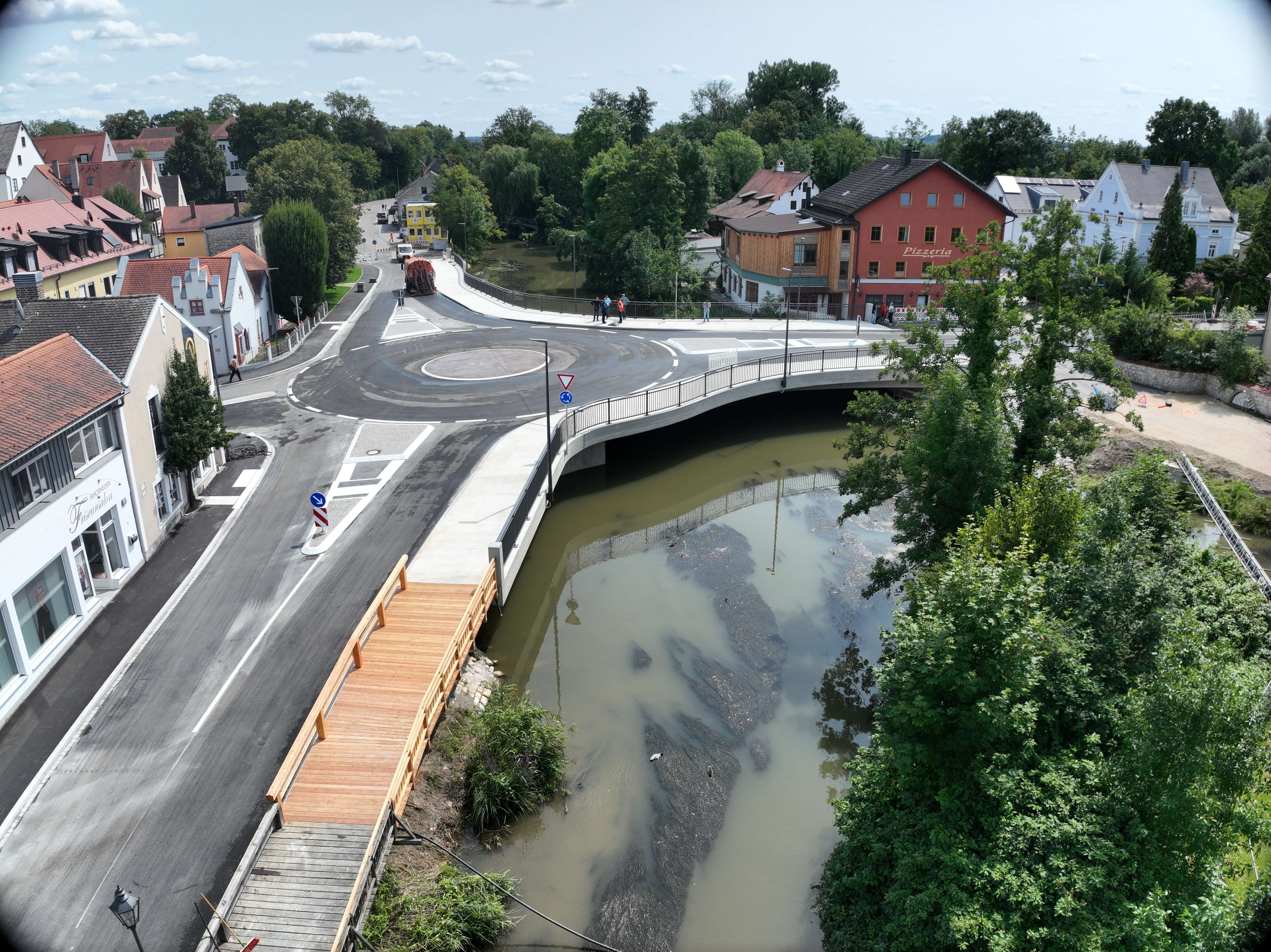 Stanglmeier Bau wurde mit dem Neubau der Brücke über die Abens beauftragt – und damit einhergehend mit dem Bau eines Mini-Kreisverkehrs, der die Staatstraße 2144 mit den anschließenden Ortsstraßen Babostraße und Abensstraße verbinden soll. Vor Beginn des Gillamoos 2025 wurden die Bauarbeiten abgeschlossen.